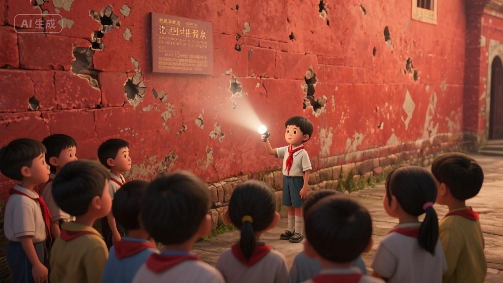 小小讲解员接力:经过培训的学生接过讲解话筒,在红围为同龄人介绍 “每道弹痕的故事”。刘思成在第一次讲解后说:“当学弟学妹追问细节时,我才真正读懂爷爷辈的牺牲”;